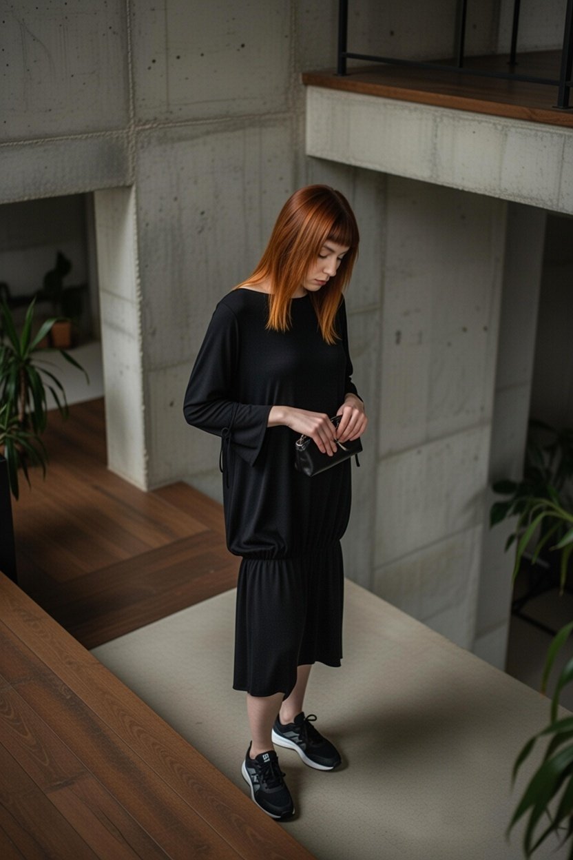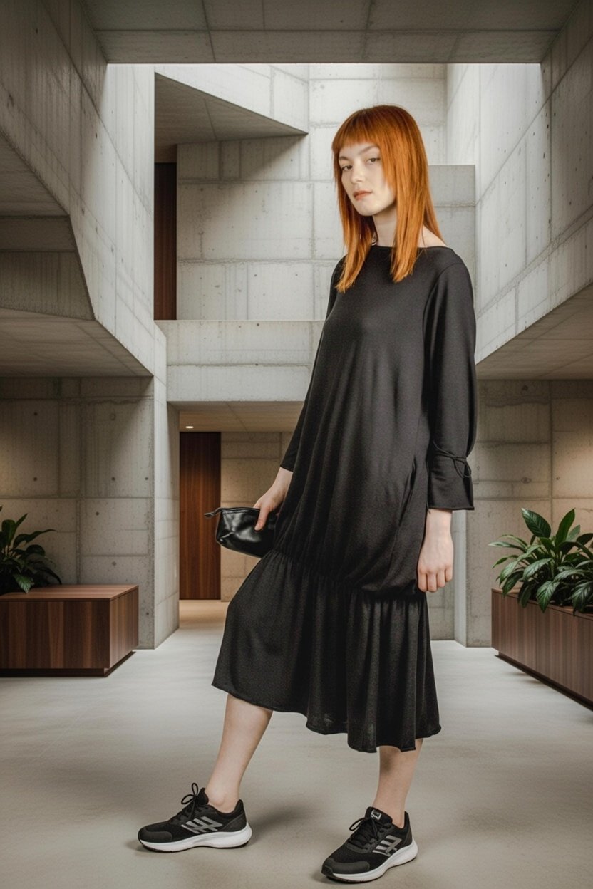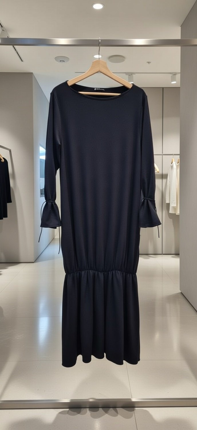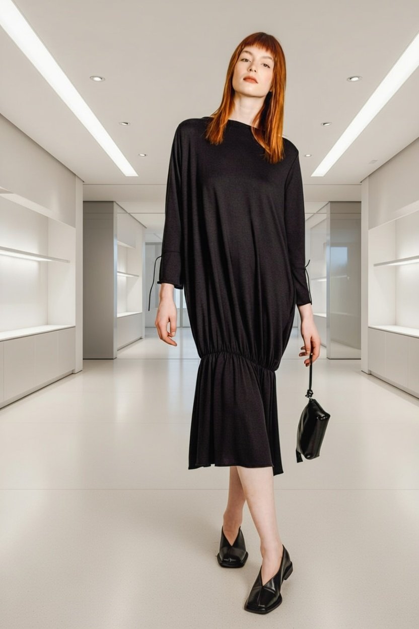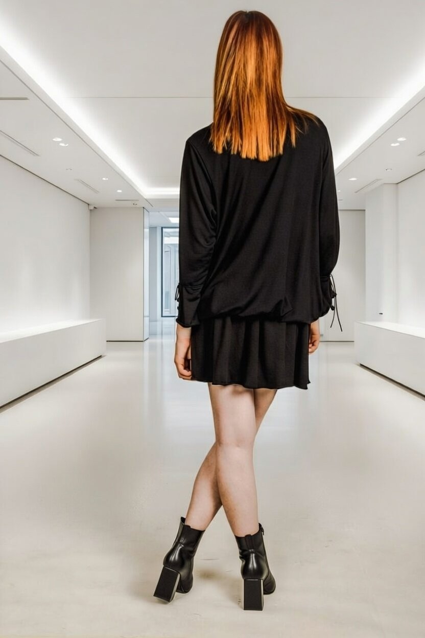 Leve e fluido, corte solto e confortável. Decote em barco, mangas com detalhe franzido na zona inferior que pode apertar com o cordão em pele. Comprimento (curto ou longo) com acabamento irregular elástico no final da saia.