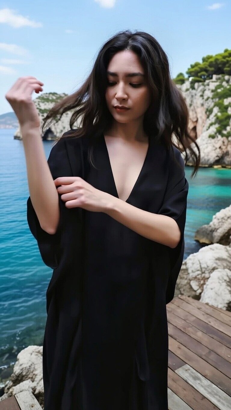 De tecido leve e fluido, este kaftan preto desliza pelo corpo, criando um efeito majestoso e etéreo a cada movimento
