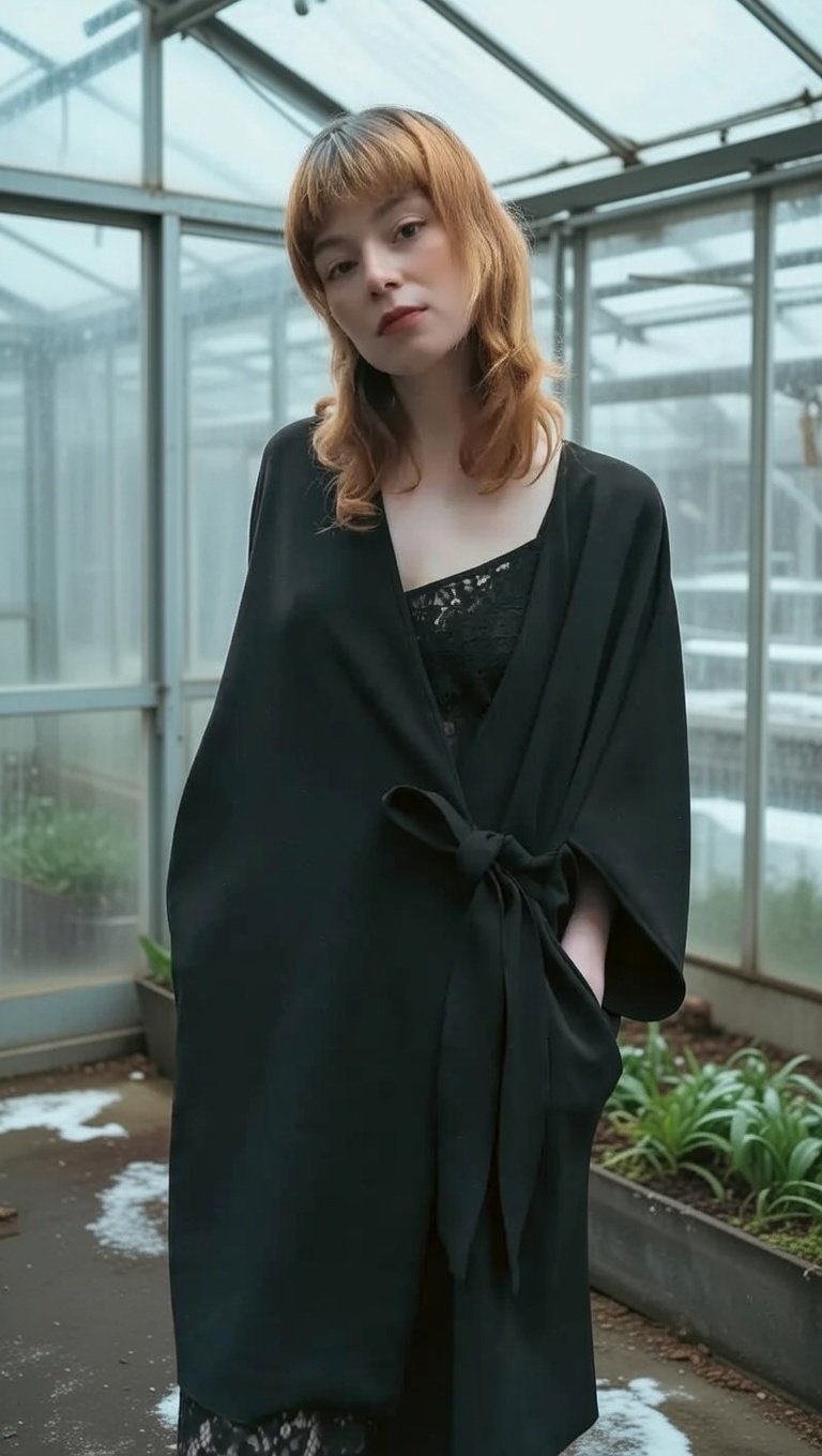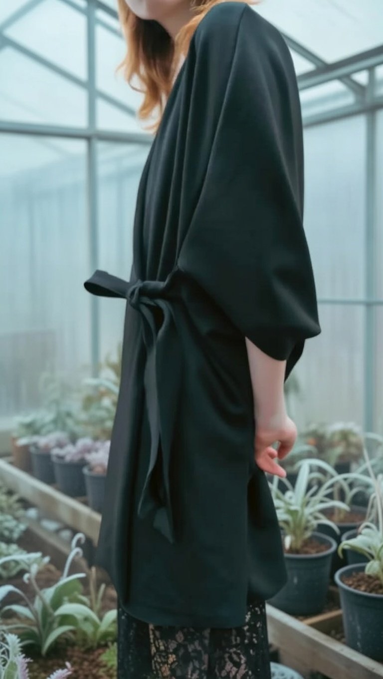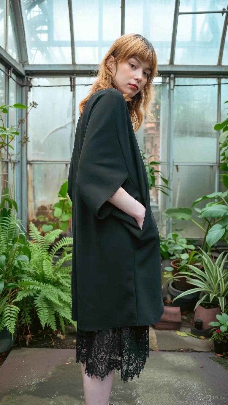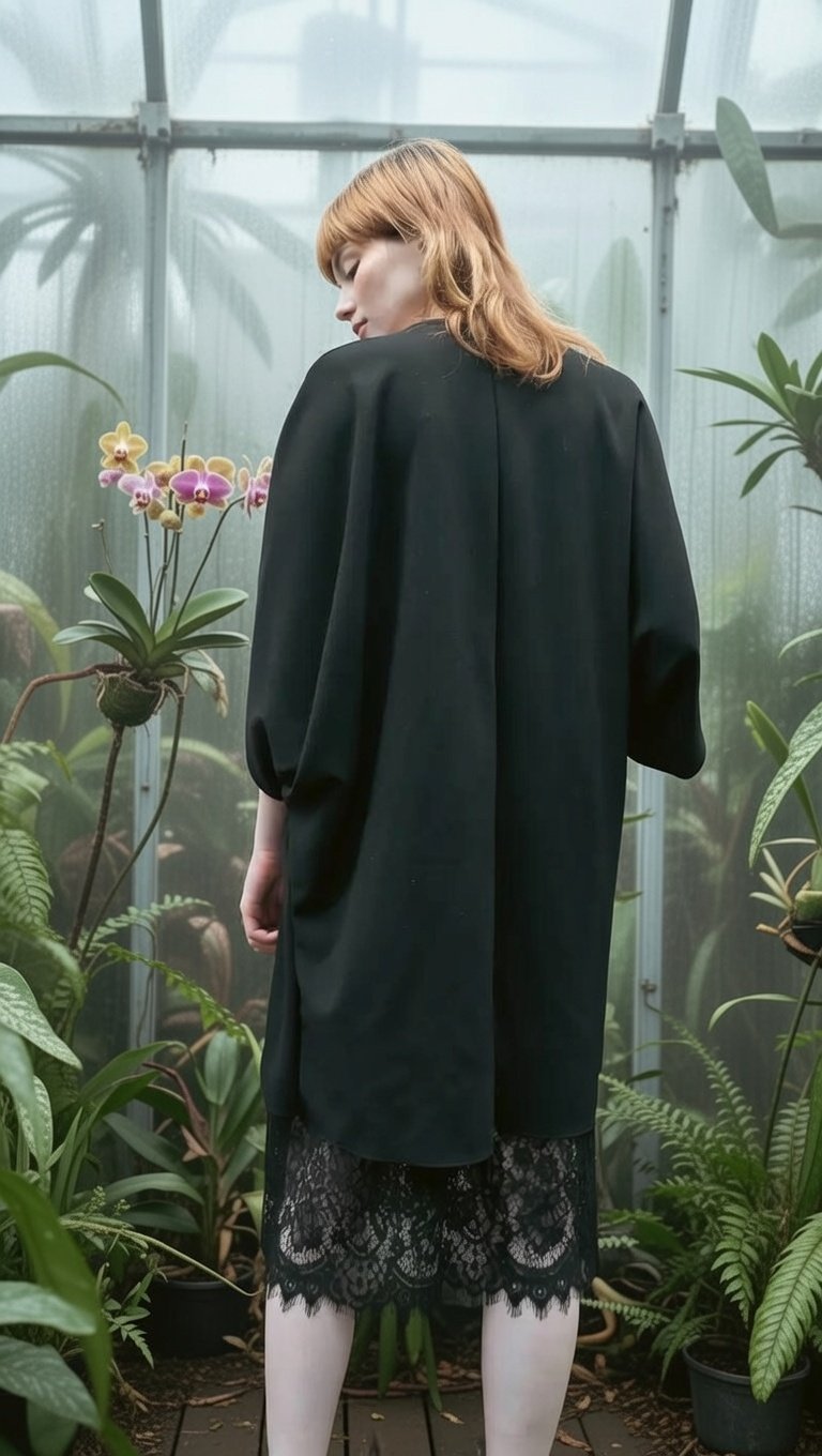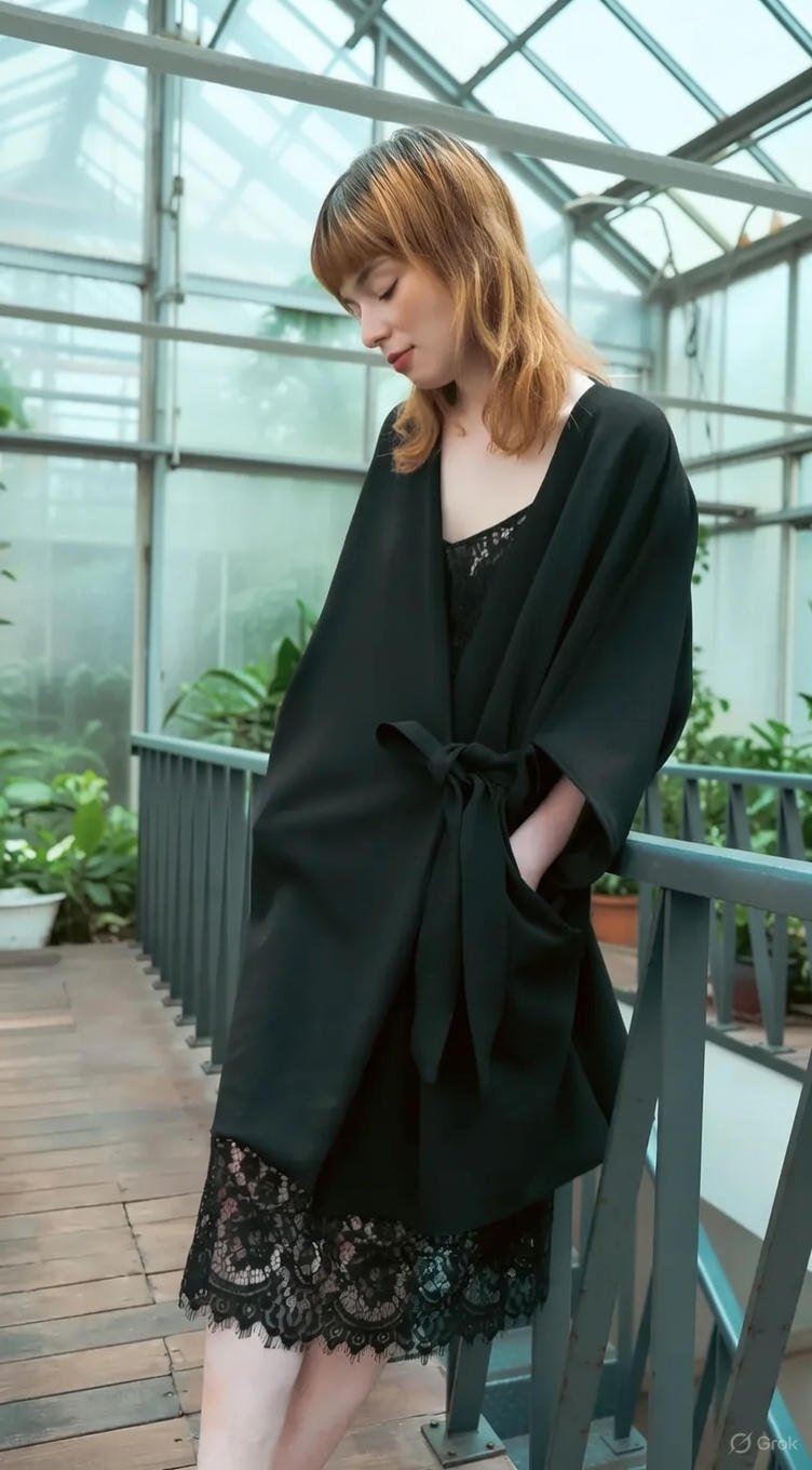 Um casaco Quimono clássico minimalista complementado com originalidade de um vestido rendado no seu interior.
