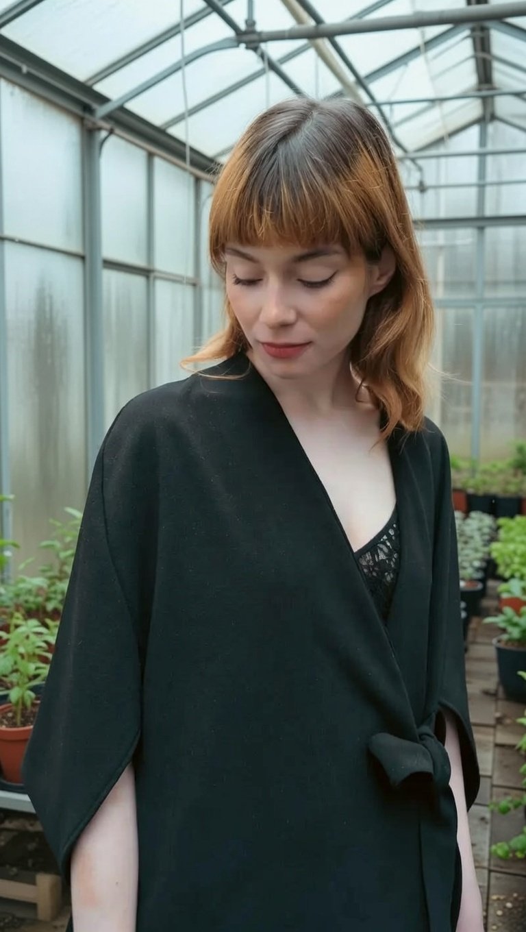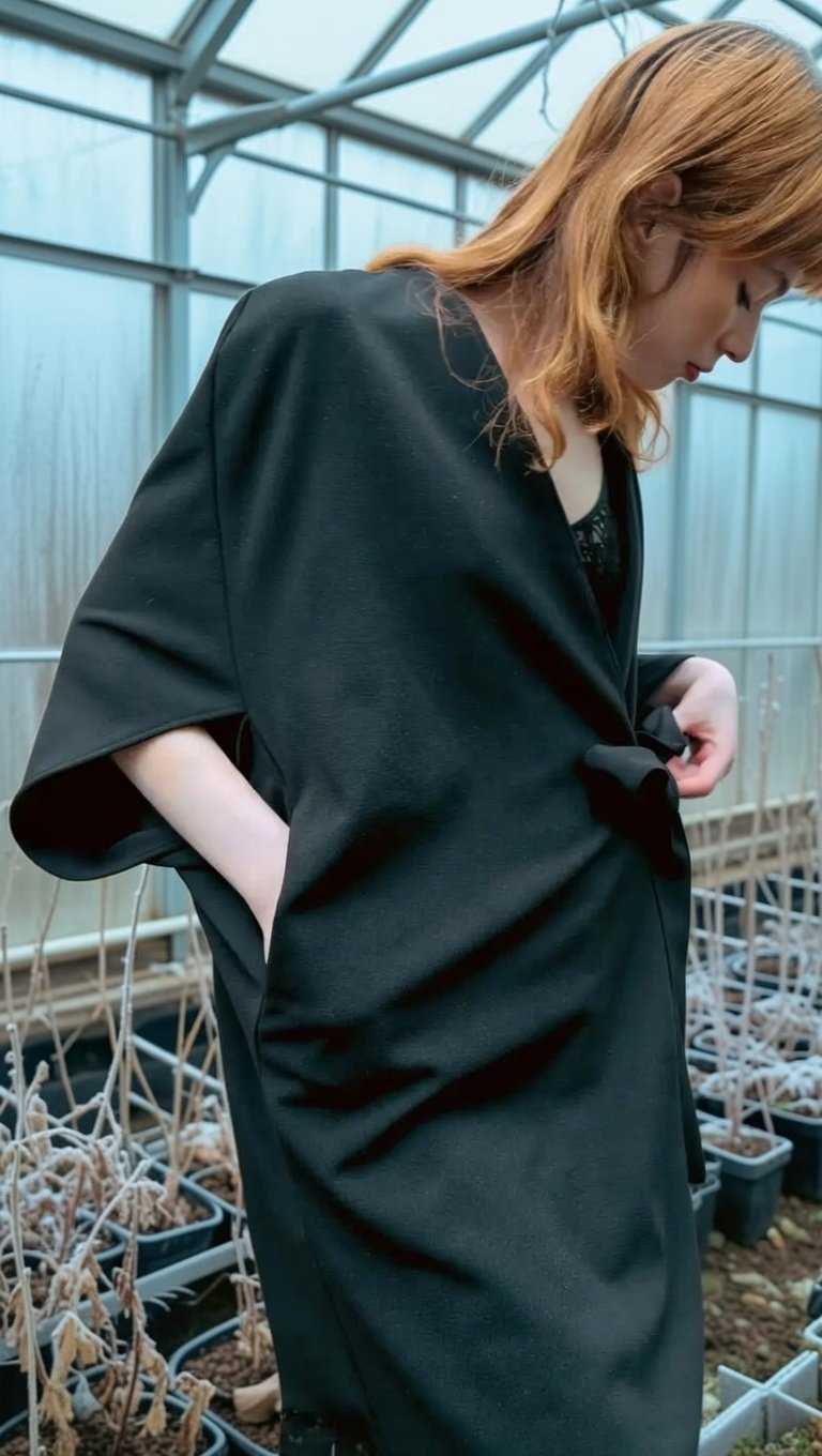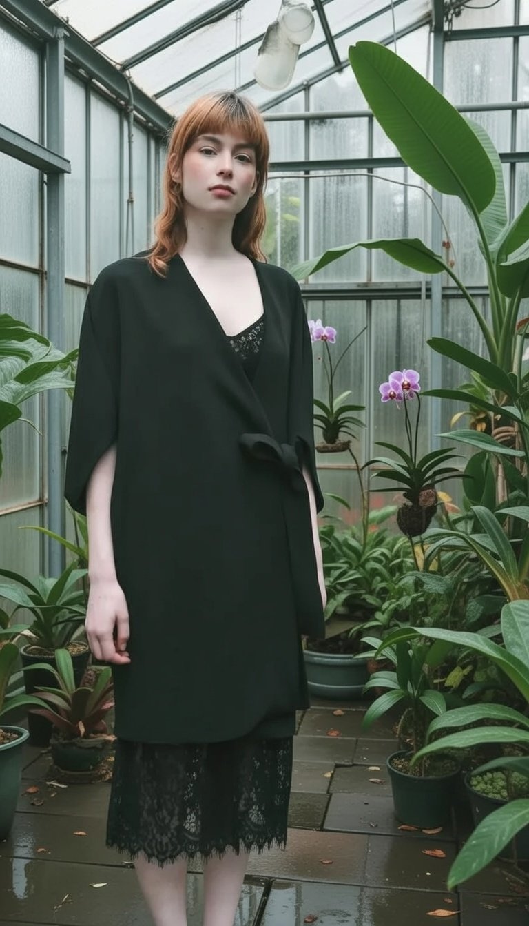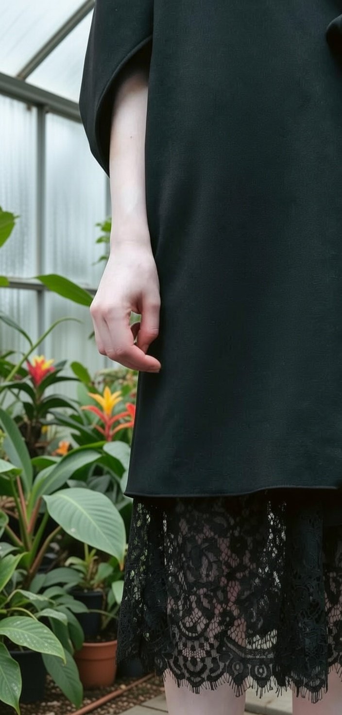 Um casaco Quimono clássico minimalista complementado com originalidade de um vestido rendado no seu interior.